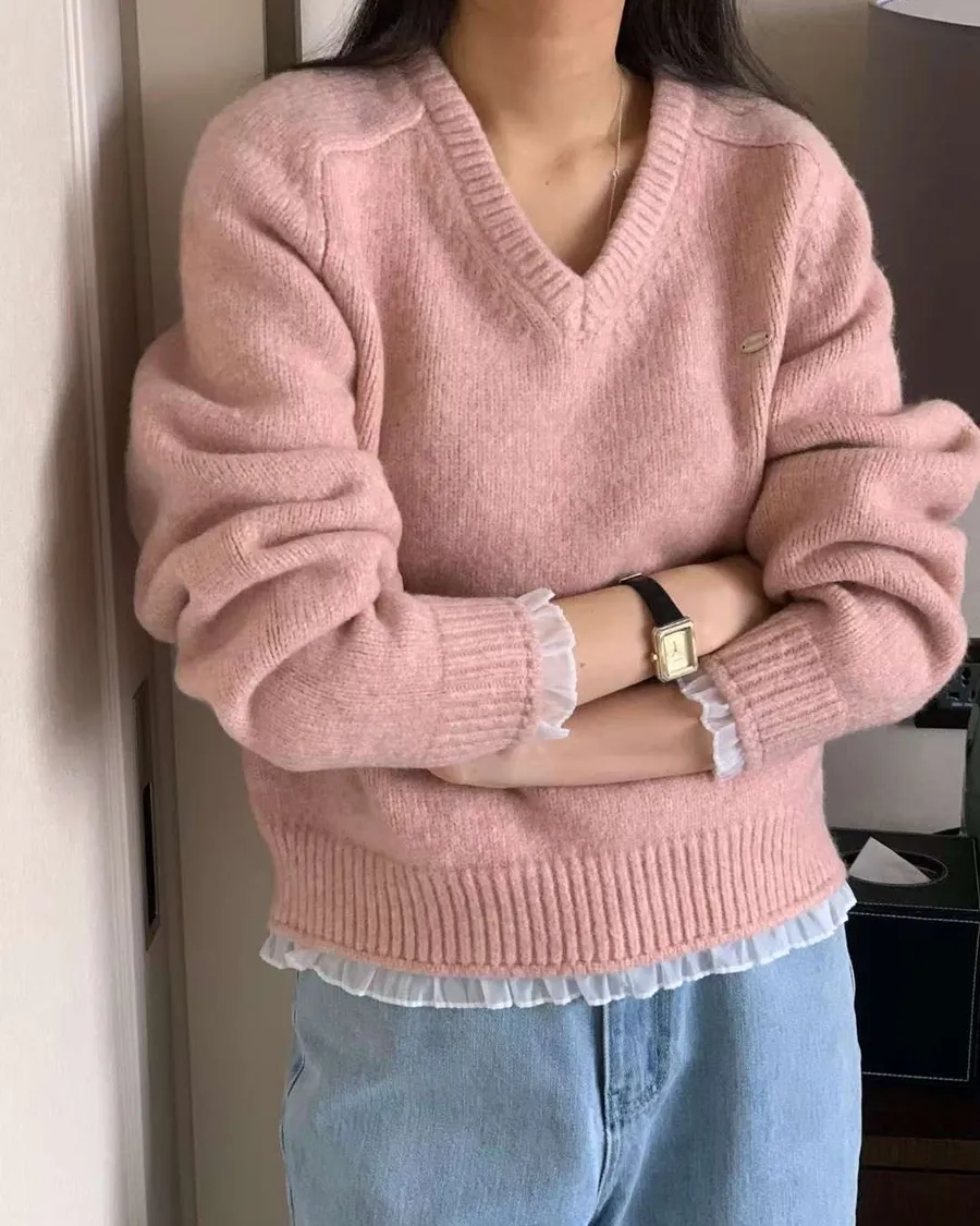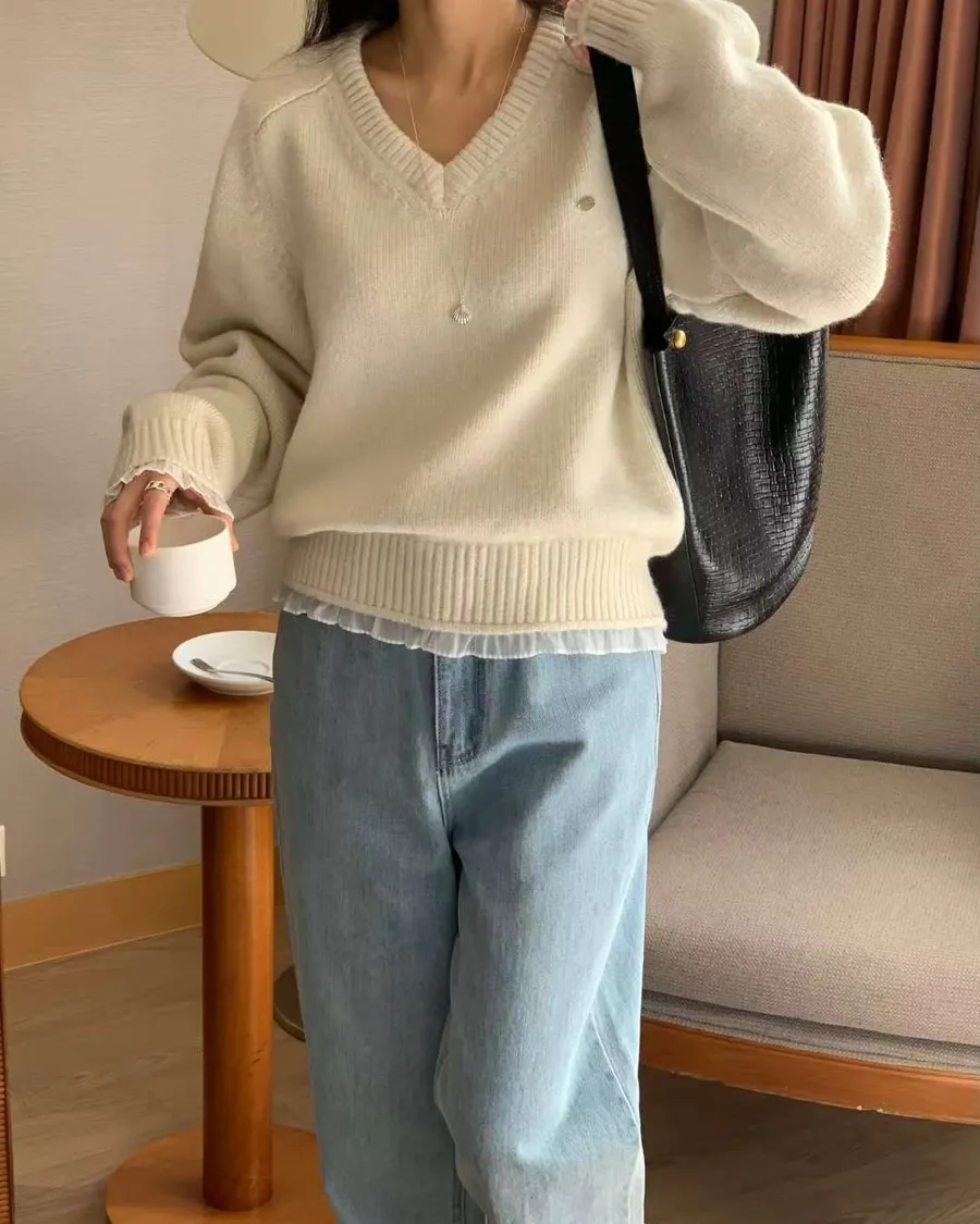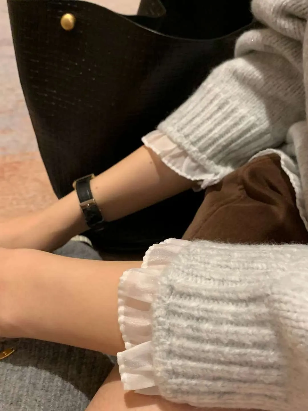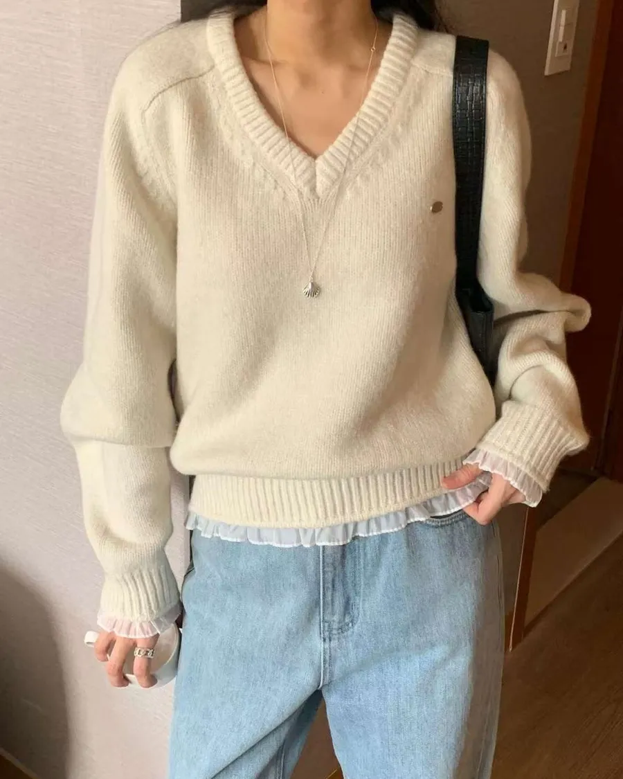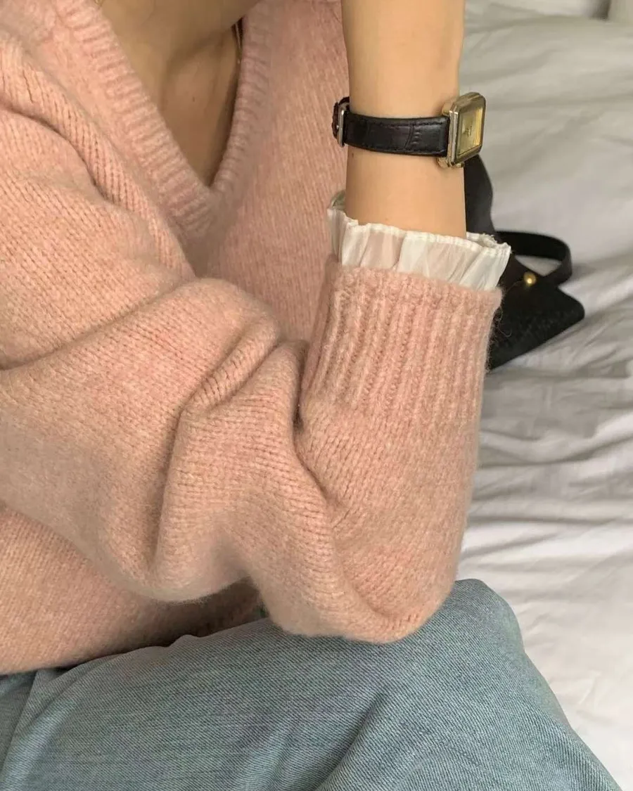 搭配內搭的蕾絲花邊,讓整體造型更添甜美細節。