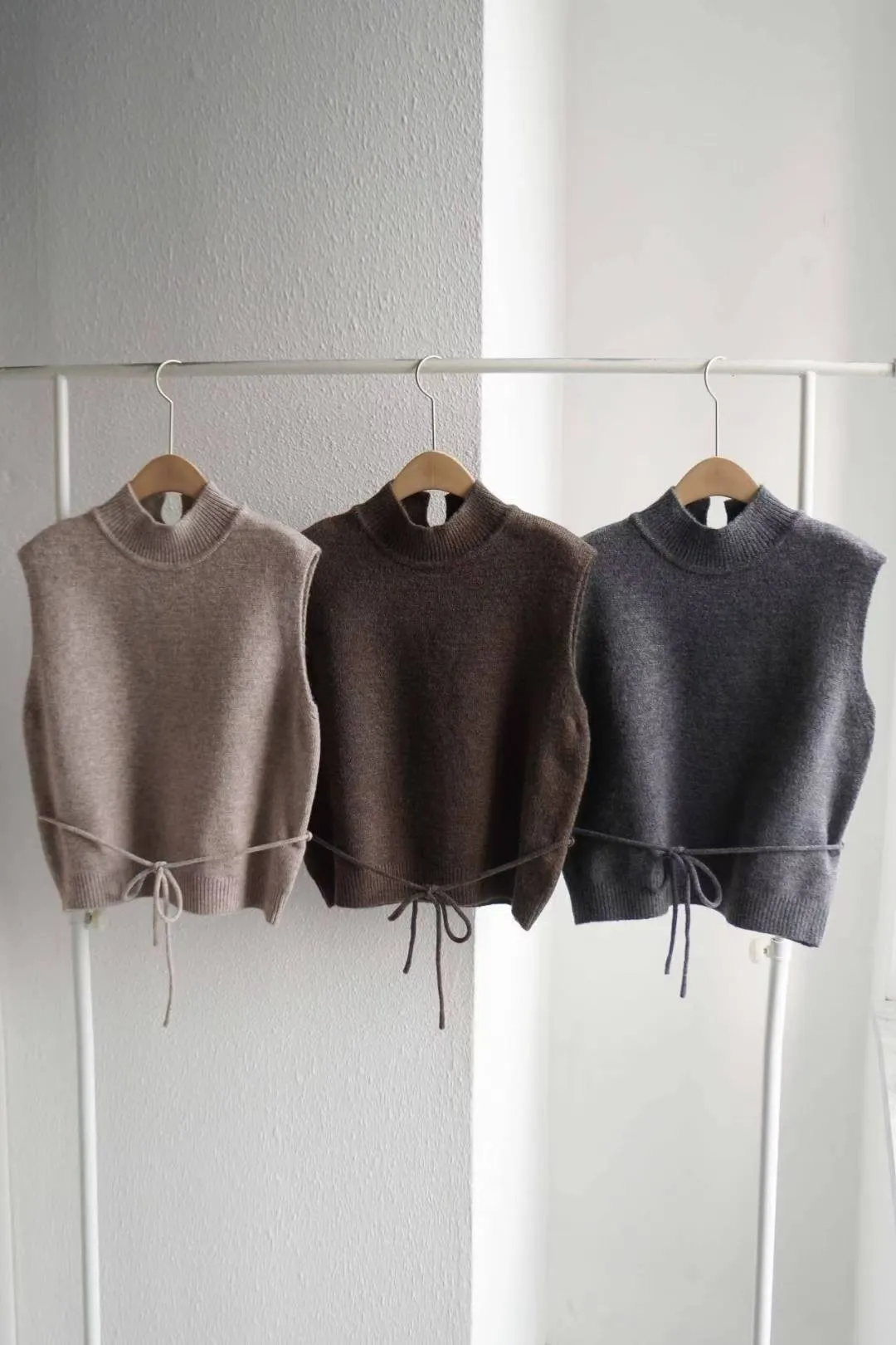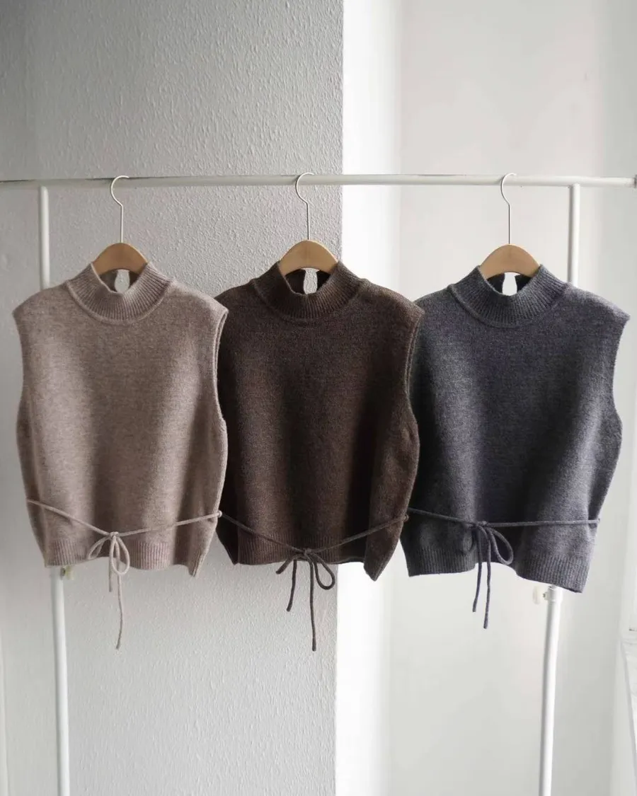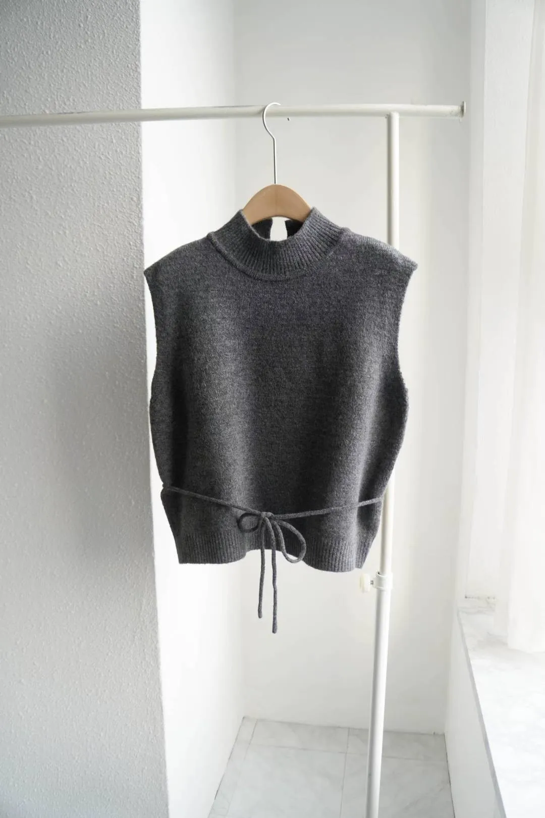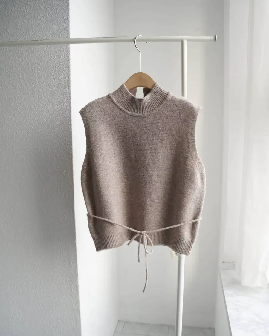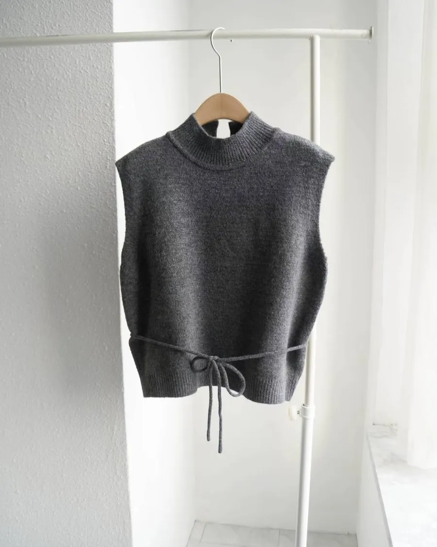這款高領綁帶針織背心,是冬季韓系搭配必備單品。版型微寬鬆、腰部附綁帶可調節鬆緊,