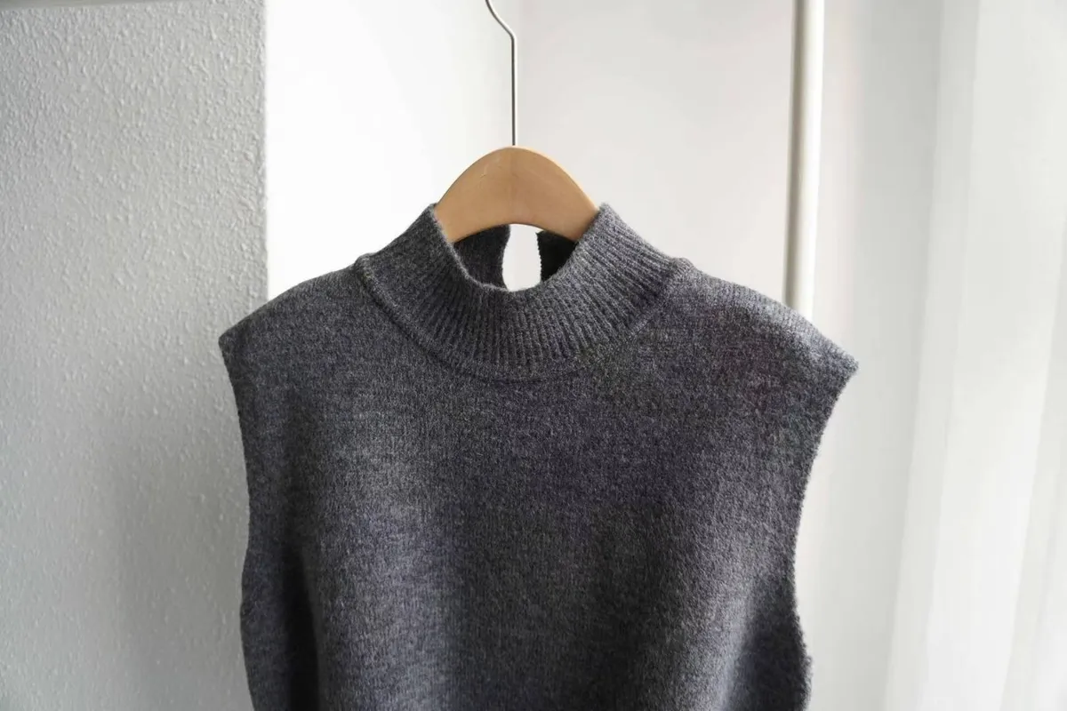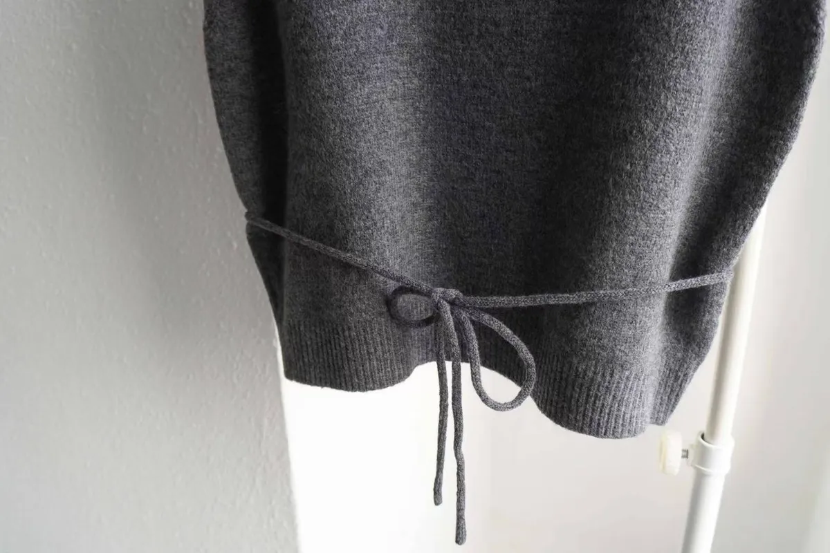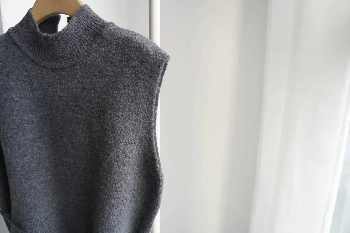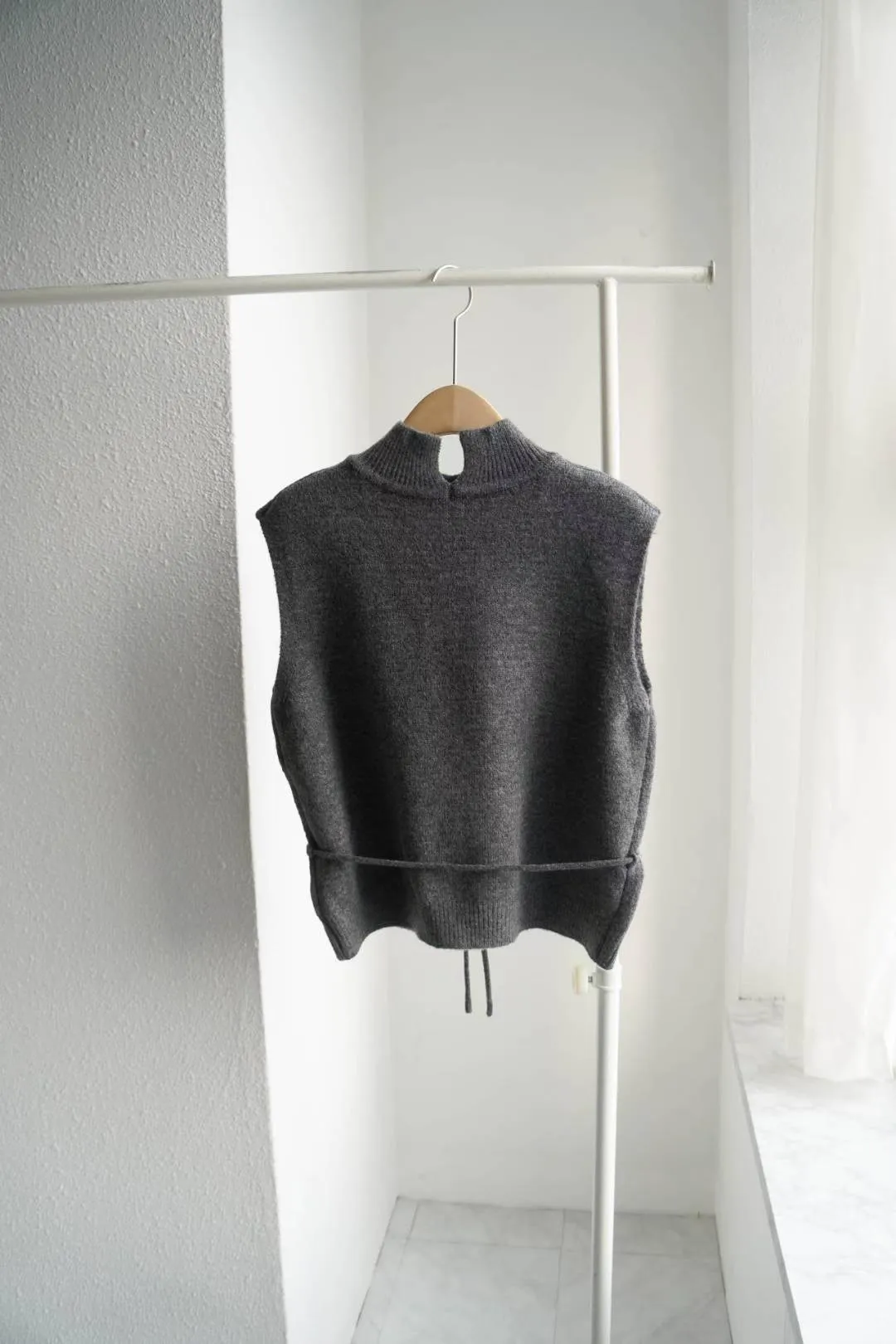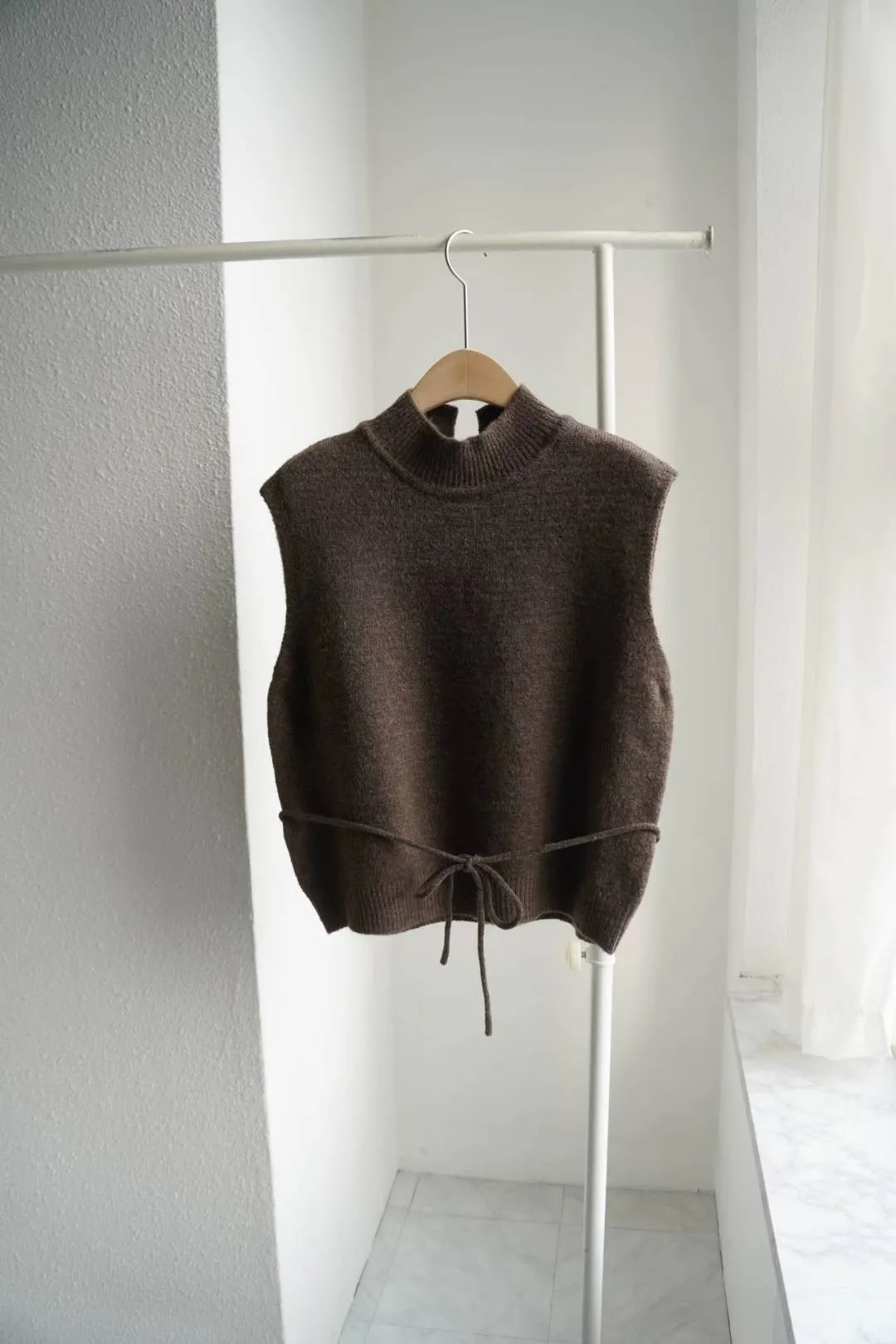 這款高領綁帶針織背心,是冬季韓系搭配必備單品。版型微寬鬆、腰部附綁帶可調節鬆緊,