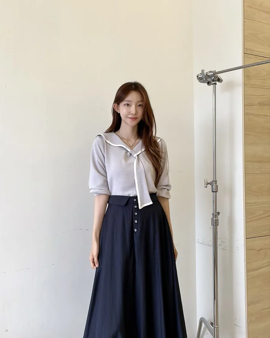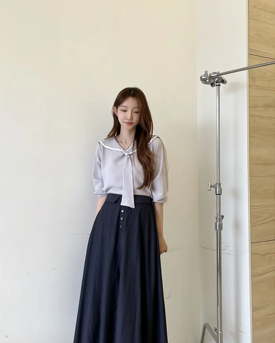 正韓Nature 海軍領氣質襯衫+A字高腰長裙