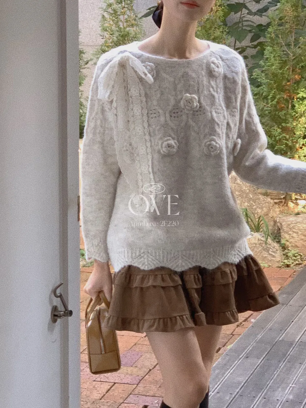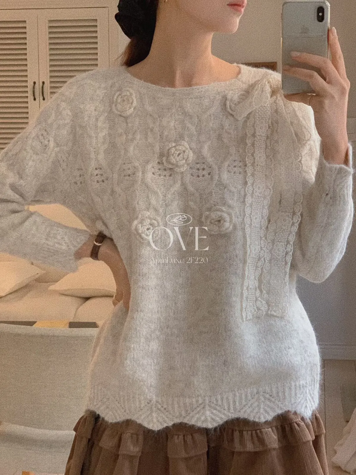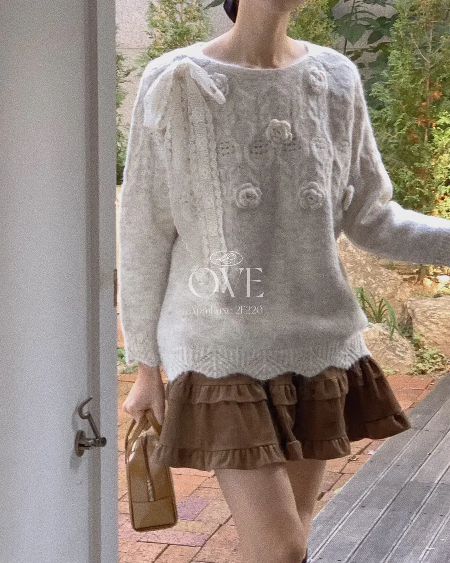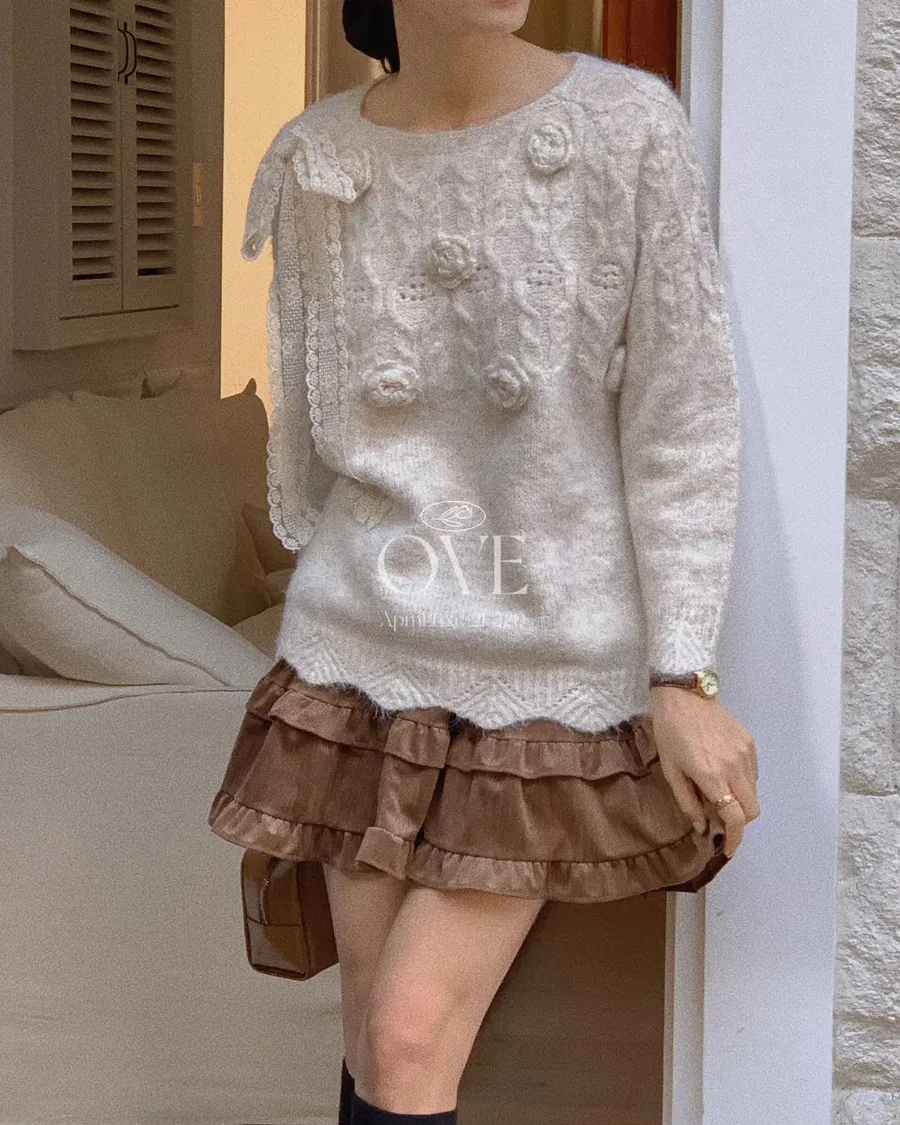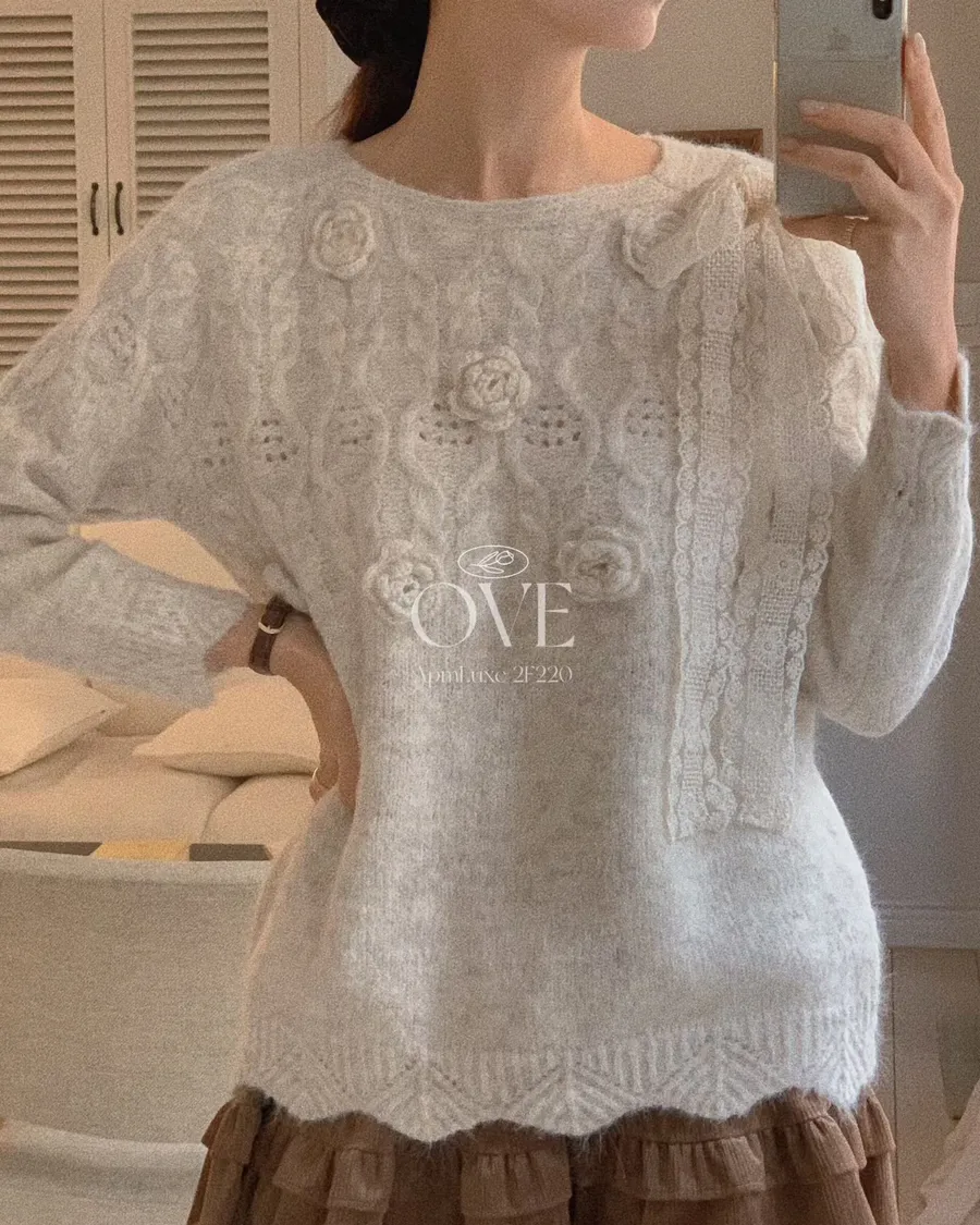 立體花朵與緹花設計:毛衣主體採用了立體的織紋和花朵裝飾