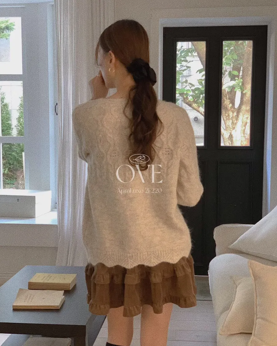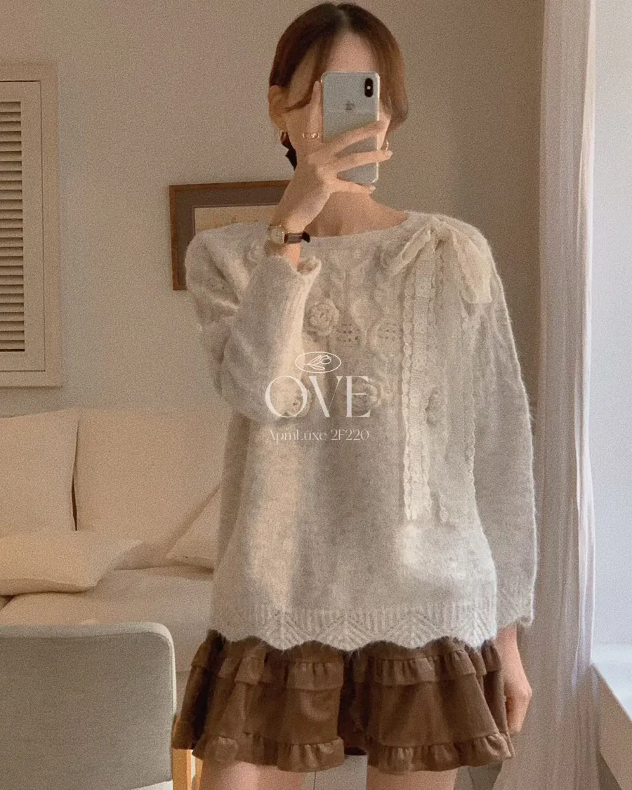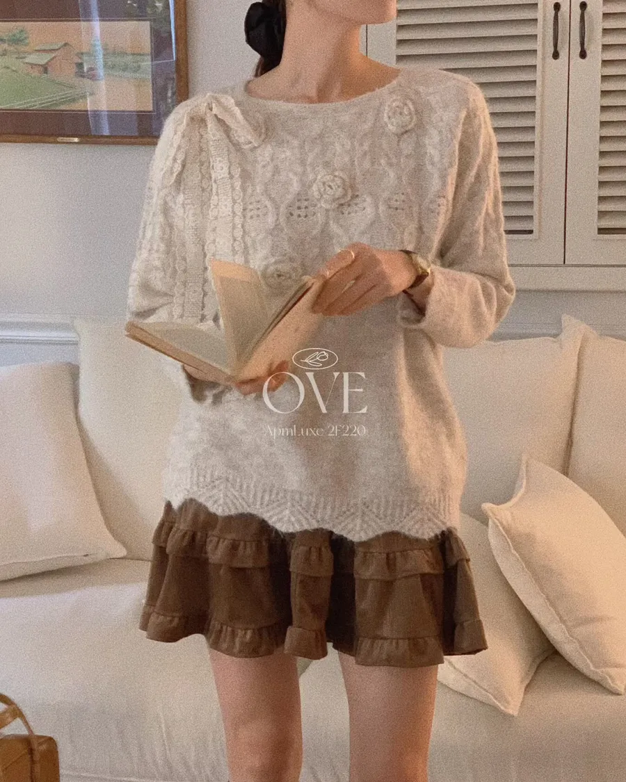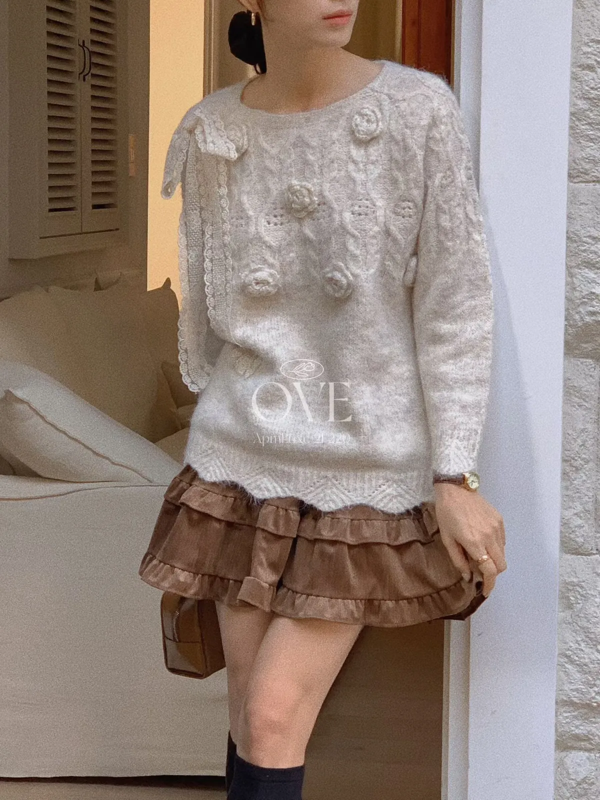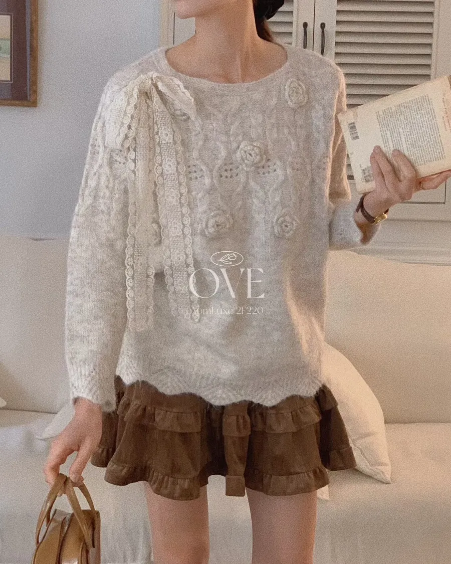 立體花朵與緹花設計:毛衣主體採用了立體的織紋和花朵裝飾