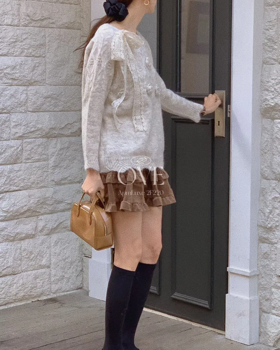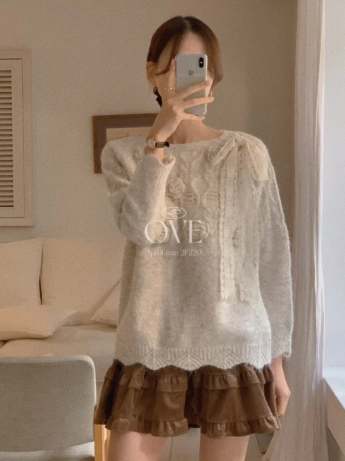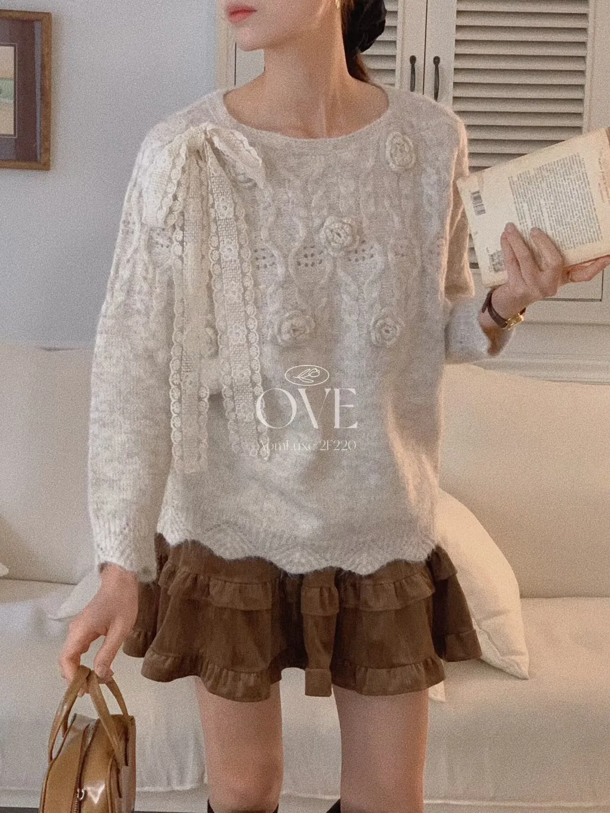 正韓 Nature立體花朵蕾絲蝴蝶結綁帶針織