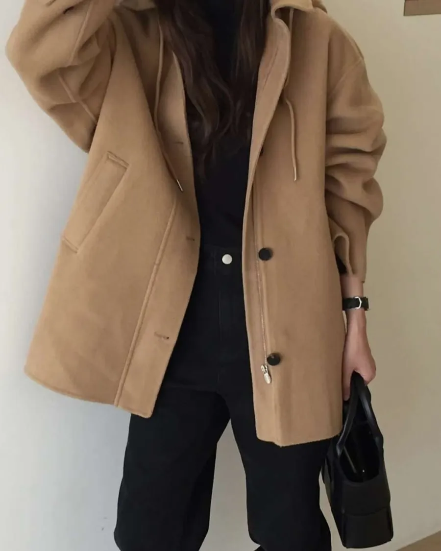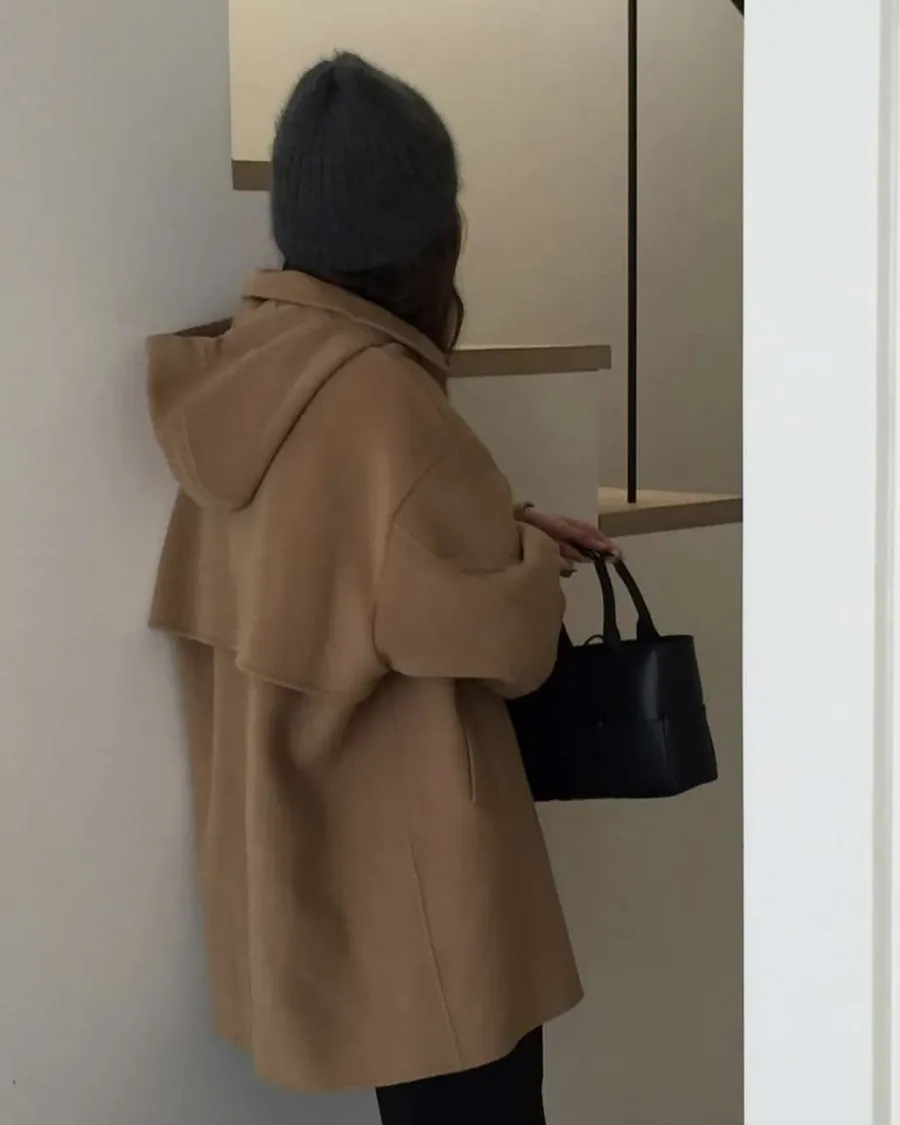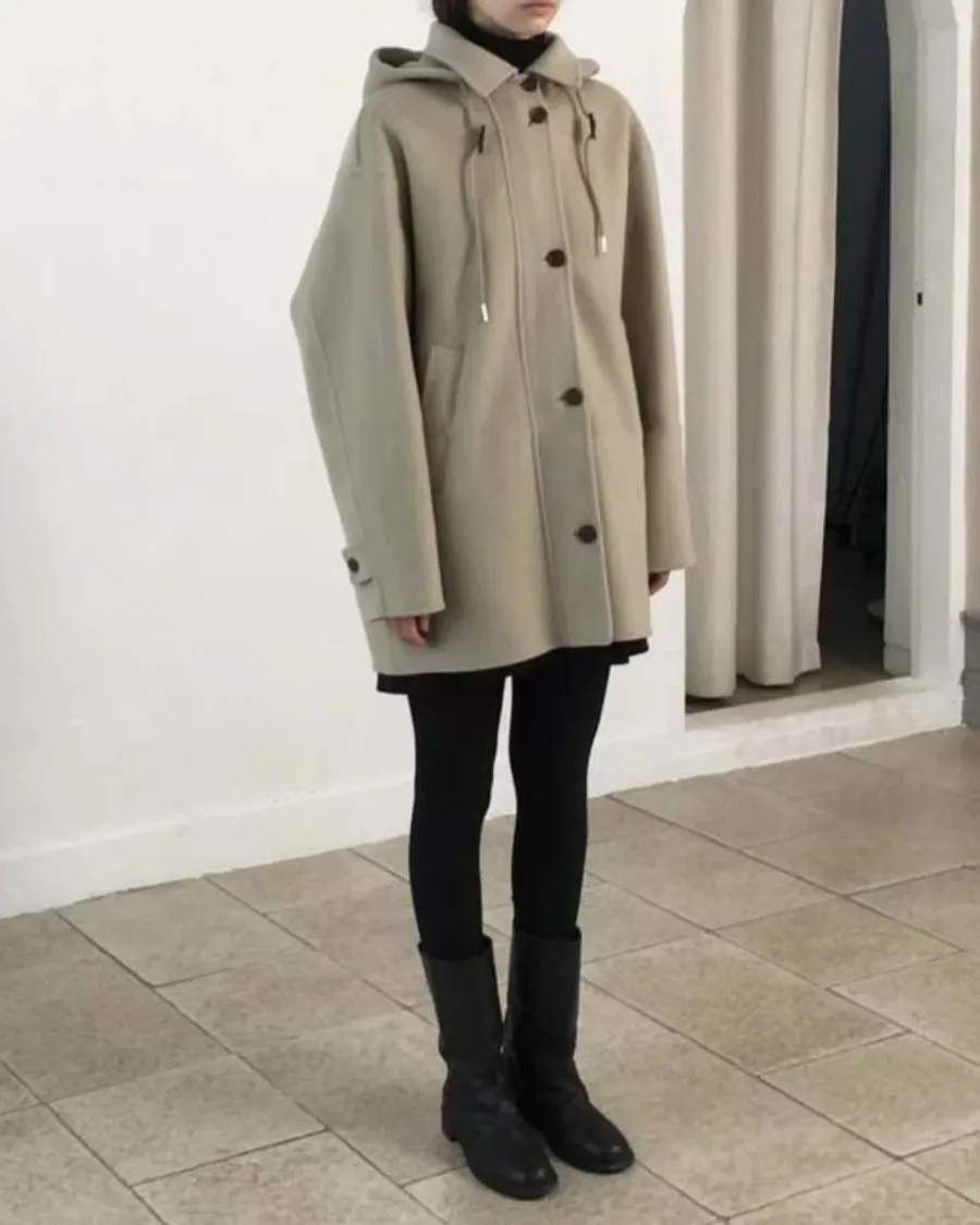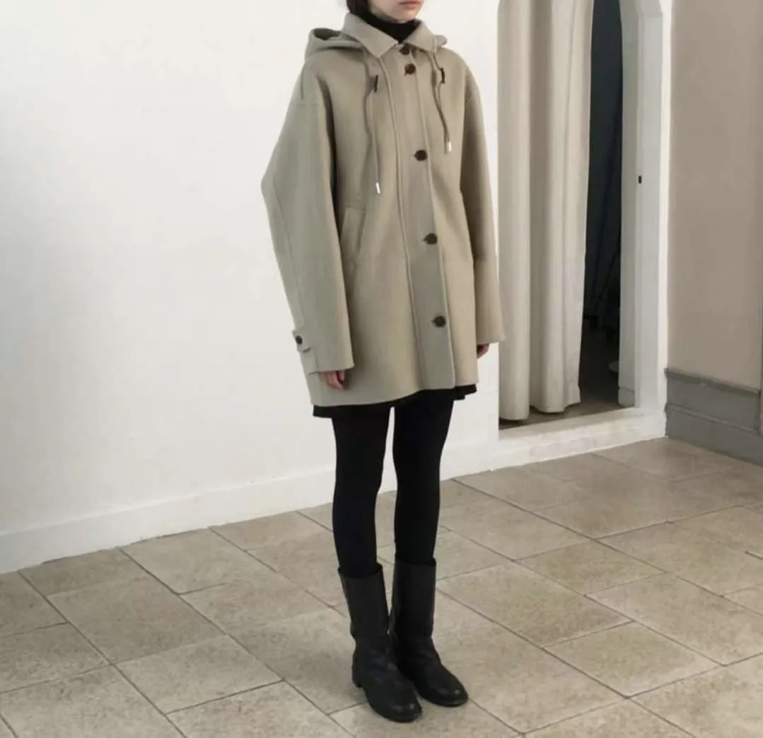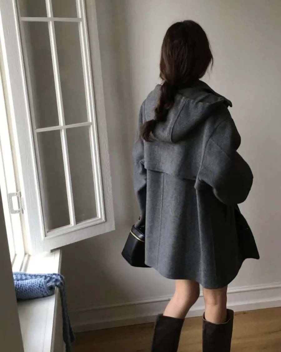 正韓寬鬆版型的連帽短大衣
