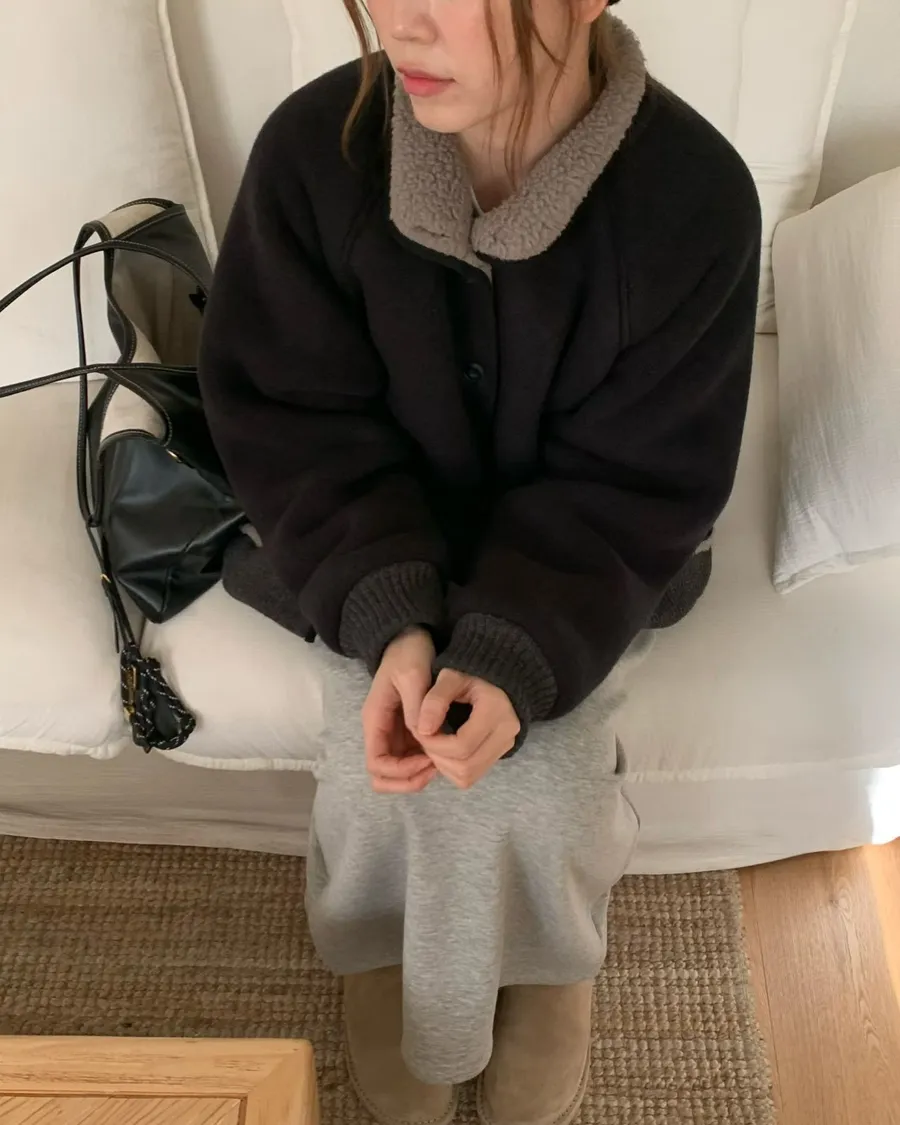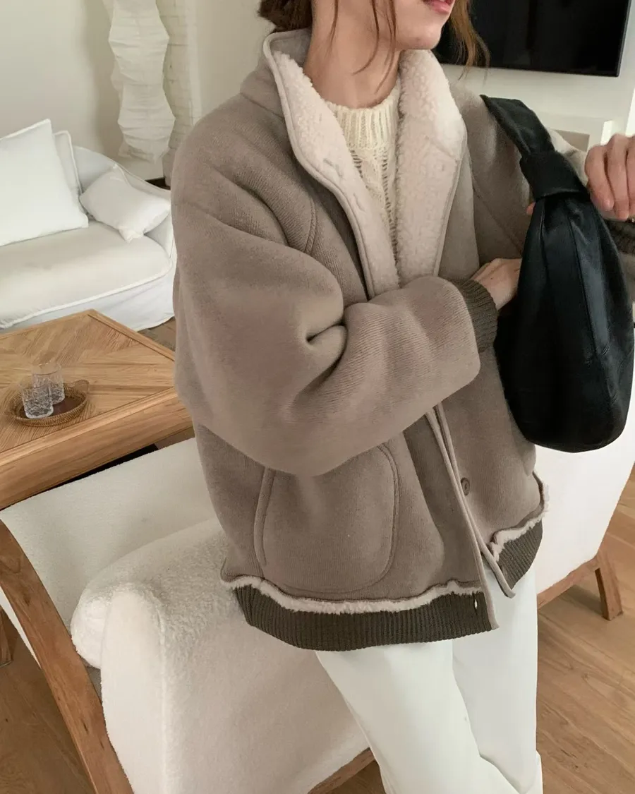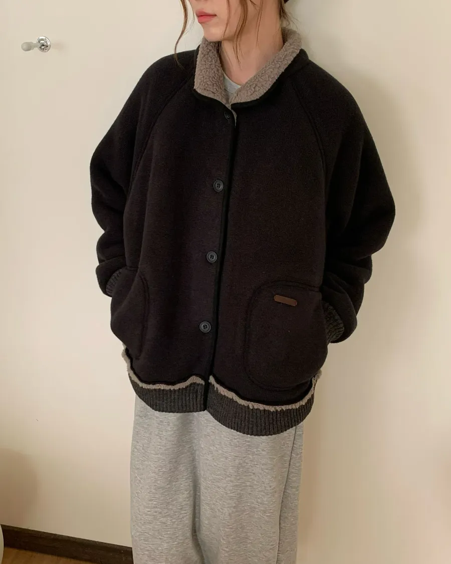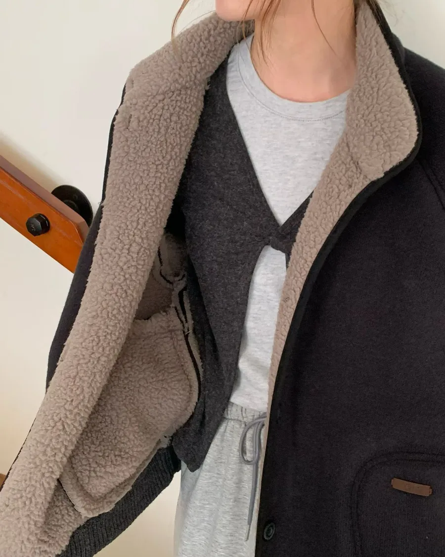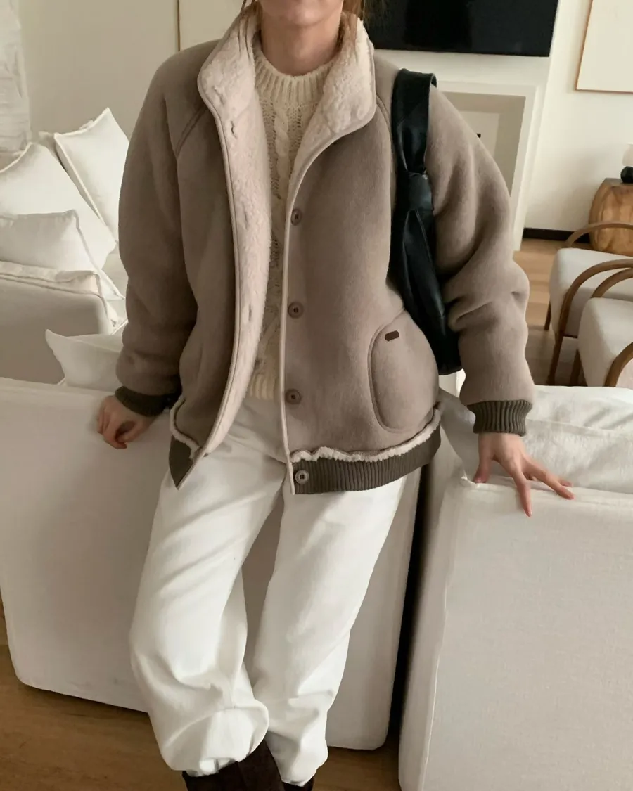 這款外套是今年超級熱門的 雙面羊羔絨保暖外套,版型是偏寬鬆的韓系休閒風,穿起來不會臃腫,反而讓整體比例更俐落。
