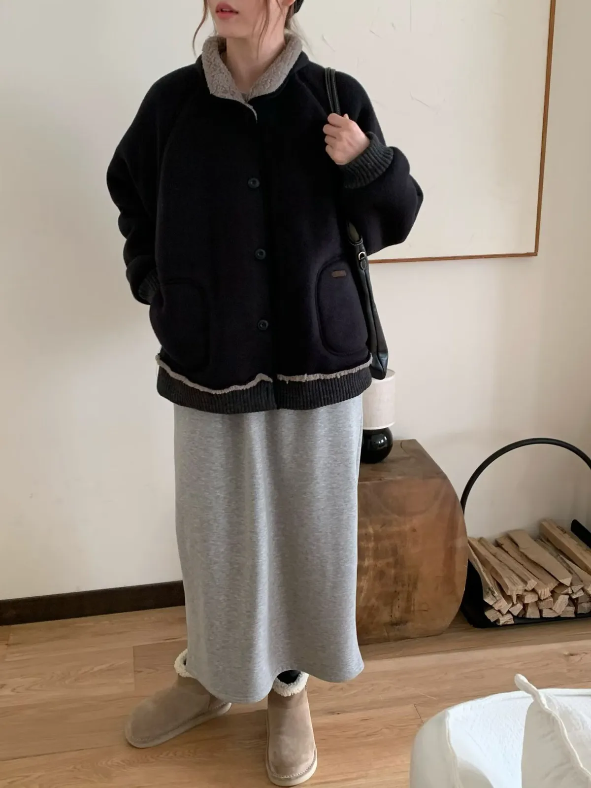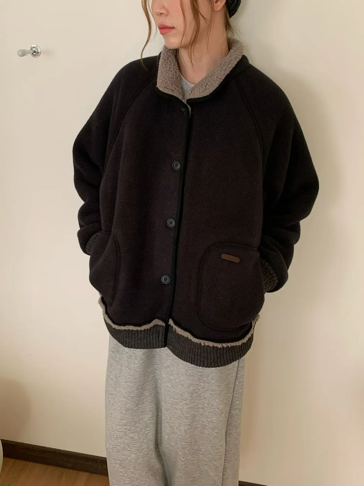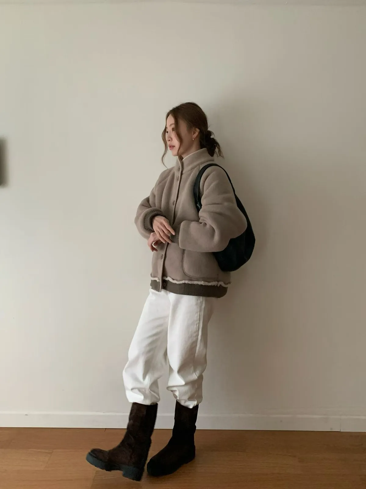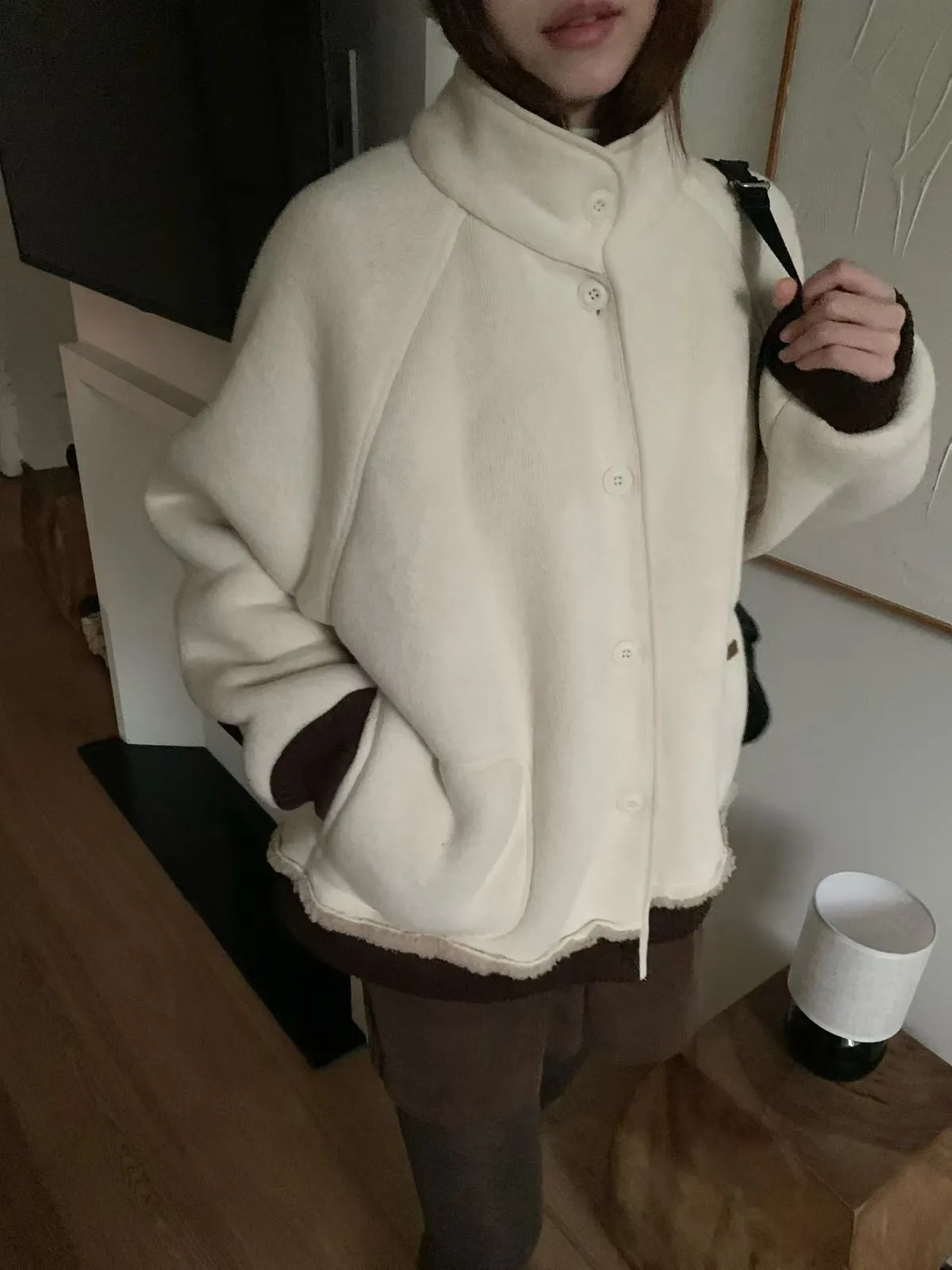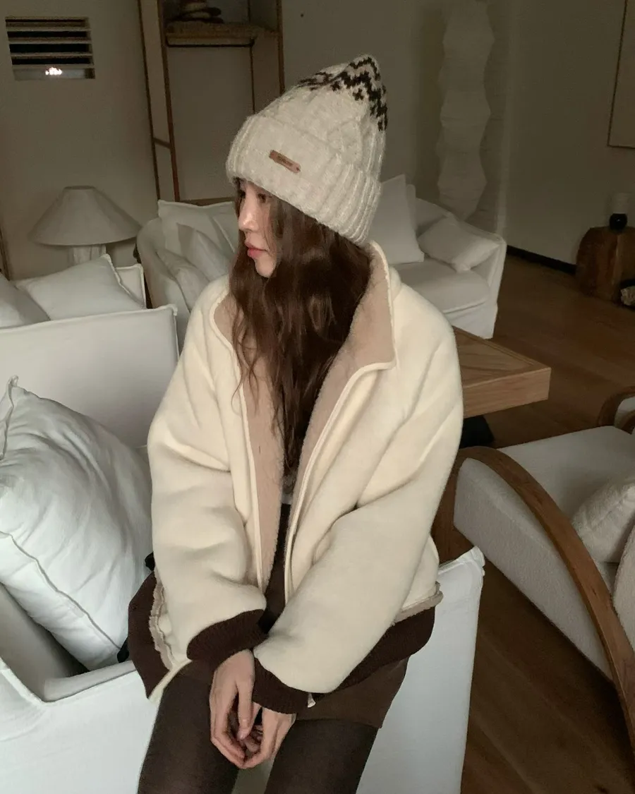 這款外套是今年超級熱門的 雙面羊羔絨保暖外套,版型是偏寬鬆的韓系休閒風,穿起來不會臃腫,反而讓整體比例更俐落。